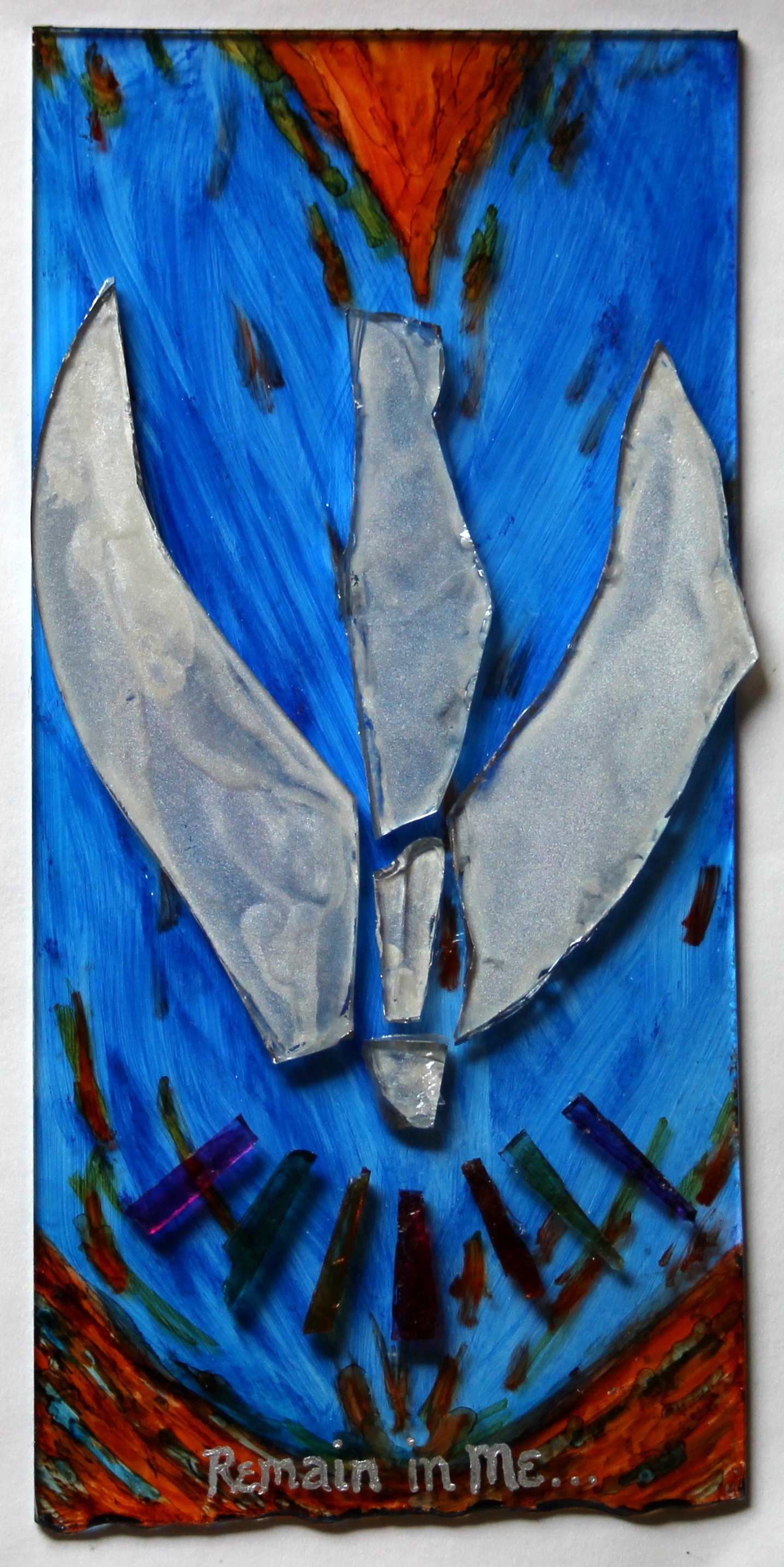 The other gift is a glass sculpture I was allowed to fashion depicting the Spirit as a dove descending, along with Christ’s words “Remain in me”. As with the Cross posted at the onset of Lent, bits of broken glass salvaged from my broken window came together to form the image.