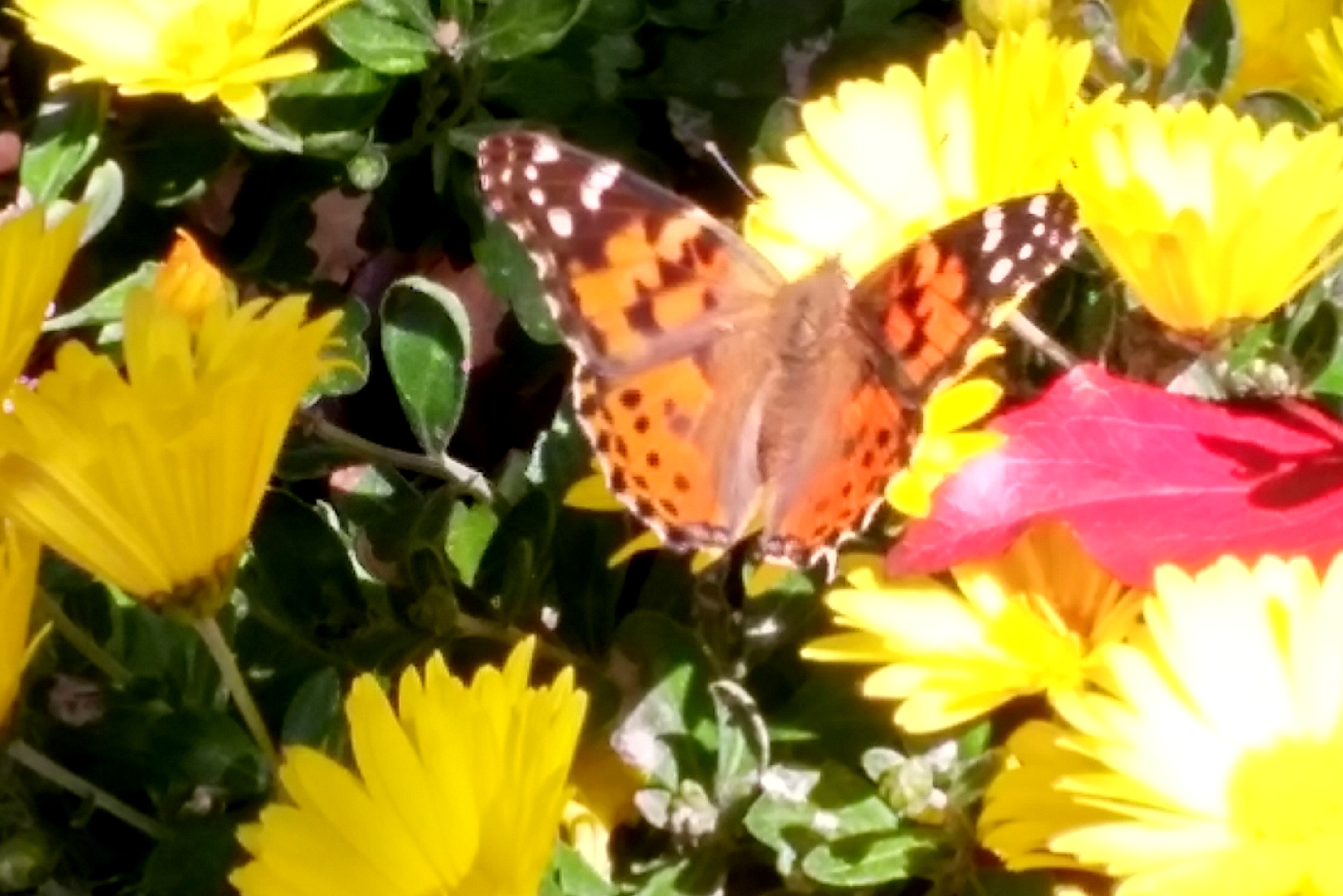 Is it mere coincidence that, even though we have had many unseasonably warm days this fall, only today did I see a butterfly? That I happened to be looking out of my window while gathering towels for the laundry when it appeared?