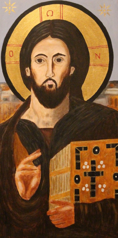 (Note: My Orthodox readers are likely to recognize this painting as a copy of a very famous icon, the oldest known surviving icon of Christ Pantocrator. For those less familiar, much is available online. Suffice it to say that the original icon clearly made the two sides of the Image differently, portraying the One who is both God and man, both Judge and Redeemer.)